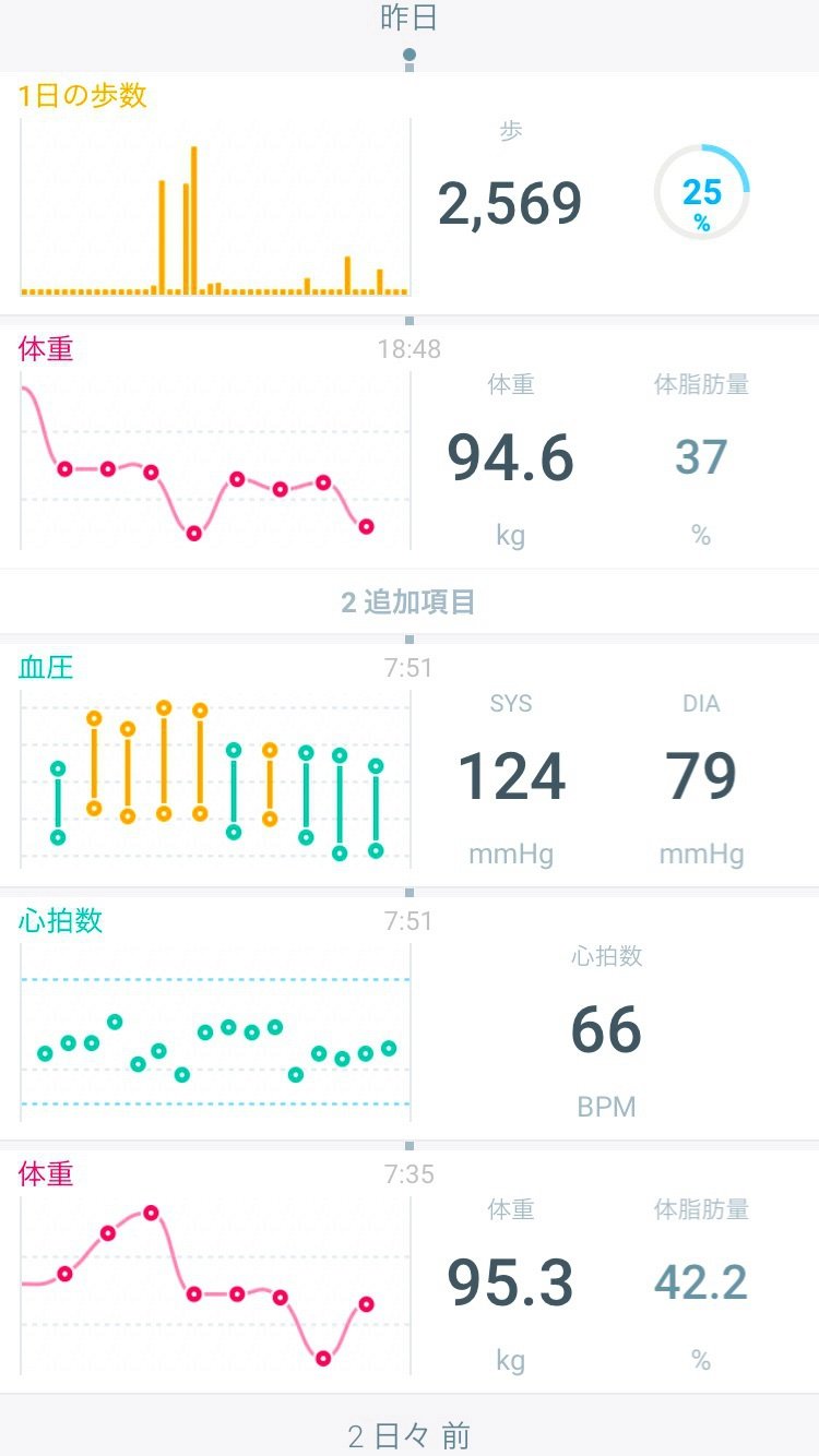 あと、「Withings Wifi体重計」と組み合わせて使えば、アプリのダッシュボードで「血圧」「体重」「歩数」「摂取カロリー」の現在値を並べてみたり、